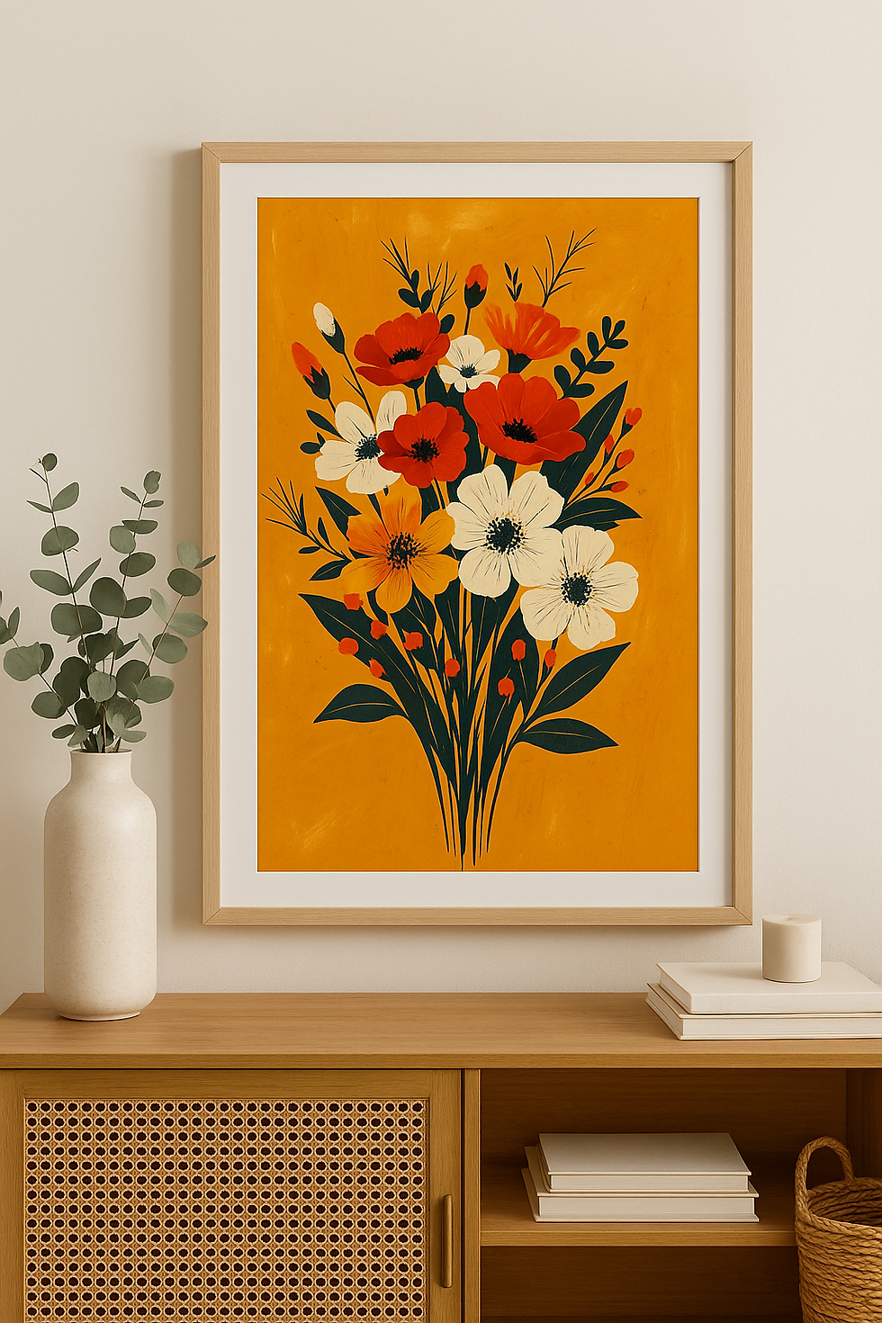 Bold Floral Bouquet Poster – Modern Painterly Mustard Wall Art, Red Poppies